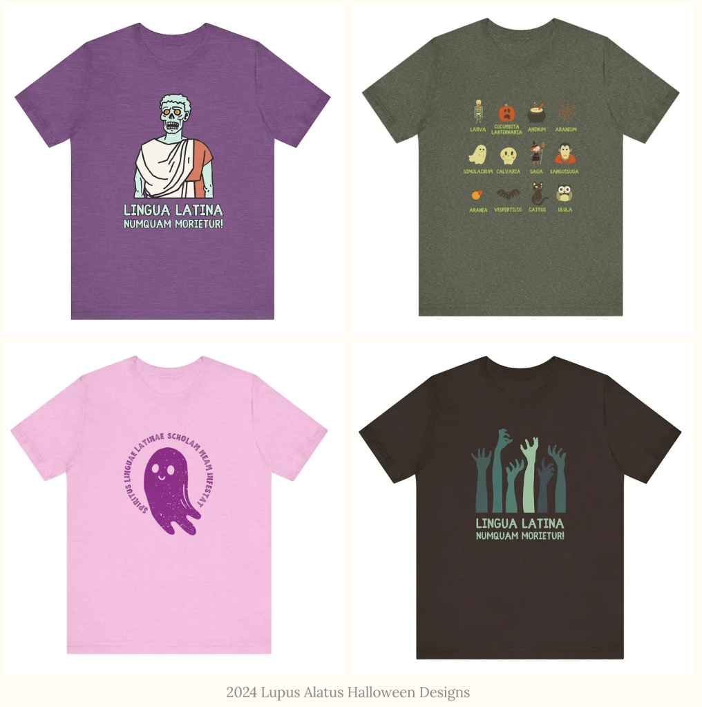 We’ve added a quite a few new designs to our shop for Halloween 2024. “Lingua Latina Numquam Morietur!” (Latin will never die!) is proving to be our most popular so far. The green shirt above with 12 spooky vocabulary words also comes in a poster. If you are a teacher and would like a high resolution image of this poster for free, email contact@lupusalatus.com. All spooky and Halloween designs are 15% off through the end of October.