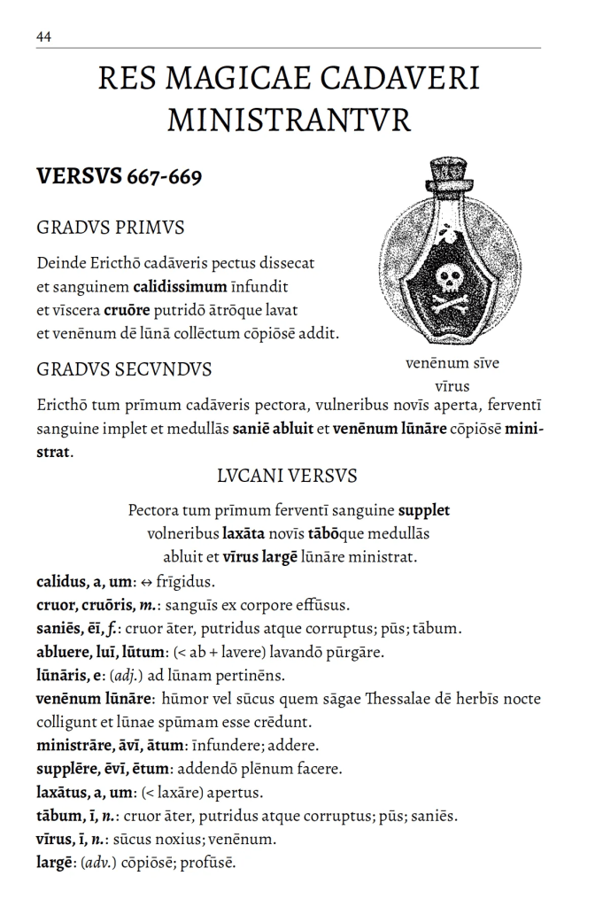 Here’s the beginning of the spell as presented in our book, Erictho: Tartarorum Terror, showing how we unpack Lucan’s Latin into two different levels for the reader and provide a thorough Latin-Latin glossary.