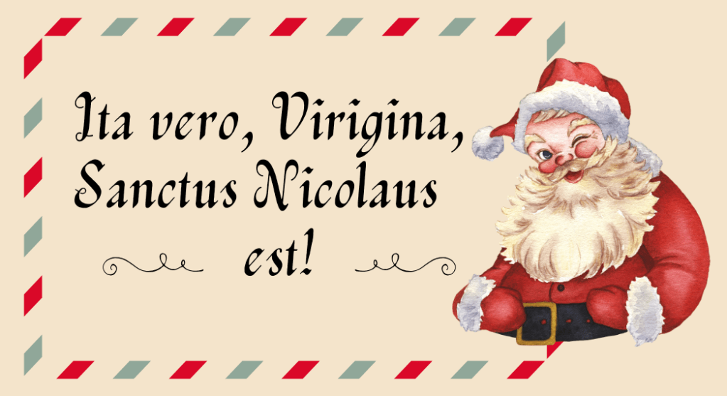 The most reprinted newspaper editorial in the English language is a response to eight-year-old Virginia O’Hanlon’s question about the existence of St.Nick. The Sun’s editor Francis Pharcellus Church first published his thoughtful response in 1897, which was widely reprinted during the holiday season throughout the 20th century. And a Latin translation exists! Before Christmas, we will edit the Latin version of this timeless Classics and post a recitation of in on Youtube. We’ll also make a pdf of the text available here for you!